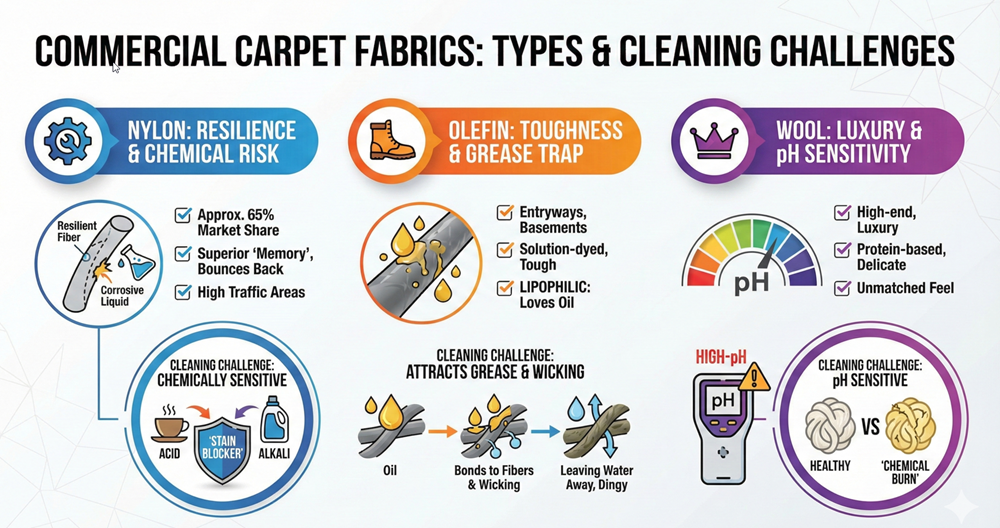 - The Nylon Cleaning Challenge: While physically tough, nylon is chemically sensitive. It is highly susceptible to staining from acid dyes (found in coffee, wine, and fruit juices). If an untrained cleaner uses a high-alkaline chemical and fails to neutralize it, they can strip the factory-applied stain blocker. Once that protection is gone, the nylon becomes a sponge for permanent discoloration.
